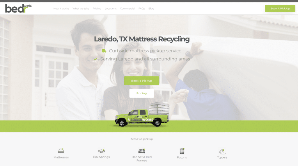 A Bedder World offers curbside mattress removal and recycling services throughout Laredo and now the ENTIRE state of Texas!